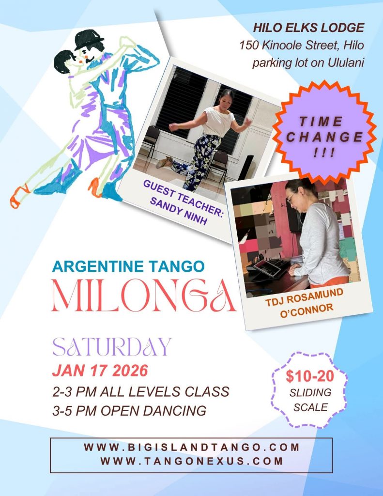 Kona Lesson and Practica has a new Venue! Every second and fourth Thursday of the month, join us for an hour lesson followed by a 30 minute practica. Rita will teach and all levels are welcome. No partner is needed. Come experience this beautiful dance at the Big Island Social Dance Club. This new dance venue is air conditioned and has a fantastic floor! Check JNRTangohawaii on facebook for any updates. Price $20.
